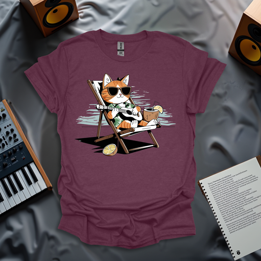 Retro 80s Relaxed Tabby Cat Playing Ukelele In Hawaii